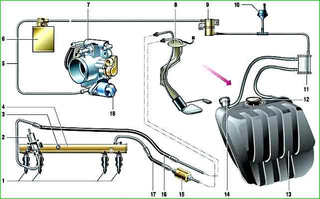 Топливная рампа служит для подачи топлива к форсункам и закреплена на впускной трубе.