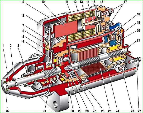Крутящий момент от вала якоря передается на вал привода через планетарный редуктор, состоящий из центральной шестерни, трех планетарных шестерен, водила и коронной шестерни с внутренним зацеплением (эпициклической).