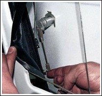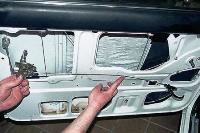 В следующей операции для наглядности тяга выключателя замка и желобок опускного стекла демонтированы
