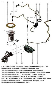 — подачи топлива, включающей в себя топливный бак 9 (рис.1), топливный модуль 1, топливный фильтр 5, регулятор давления топлива (входит в состав топливного модуля), трубопроводы и топливную рампу с форсунками;