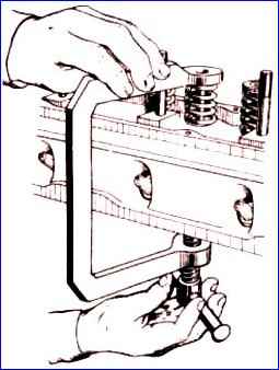 - - Demontieren Sie die Ventilfedern mit dem Werkzeug. Damit sich die Ventilfederplatte von den Crackern löst, müssen Sie nach dem Zusammendrücken der Federn mit dem Stiel eines Hammers leicht auf die Geräteplatte schlagen;