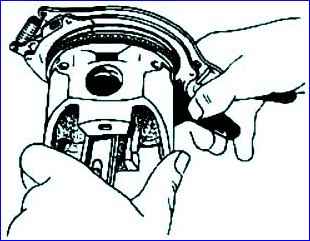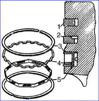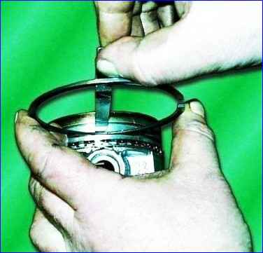- - Setzen Sie die Kolbenringe mithilfe der Vorrichtung auf den Kolben. Platzieren Sie den unteren Kompressionsring mit der inneren Aussparung nach oben in Richtung der Unterseite des Kolbens. Die Ringe in den Nuten müssen frei beweglich sein;