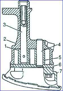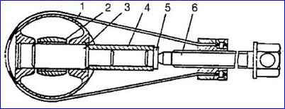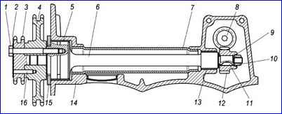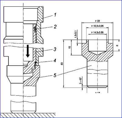 - - Montieren Sie den Gummidichtring 14 und die Buchse 6 mit einer großen Innenfase am Dichtring am Kurbelwellenschaft;