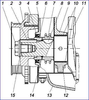 Das vordere Ende der Kurbelwelle mit einer Einzelrillenscheibe: 1 - Kupplungsbolzen; 2 - Parallelschlüssel; 3 - Dämpferscheibe mit gezahnter Synchronisationsscheibe; 4 - Manschette; 5 - Kettenabdeckung; 6 - Buchse; 7 - Sternchen; 8 – Segmentschlüssel; 9 – Zylinderblock; 10 - Hauptlagerschalen, 11 - Kurbelwelle; 12 – Hauptlagerdeckel; 13 - Ölwanne: 14 - Gummidichtring; 15 - Sicherungsscheibe