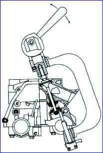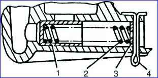 - - Drücken Sie den Dorn durch das Loch in der Abdeckung des hydraulischen Spanners auf den hydraulischen Spanner, bewegen Sie ihn bis zum Anschlag und lassen Sie ihn dann los. In diesem Fall löst sich der Sicherungsring am Kolben vom Gehäuse des hydraulischen Spanners und ermöglicht den Kolben und Gehäuse bewegt sich unter der Wirkung der Feder. Der Körper bewegt sich bis zur Unterlegscheibe in der Abdeckung und die Kette wird durch den Schuh gespannt;