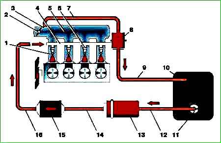 Diagramm des ZMZ-4062-Motorstromversorgungssystems 1 - Ansaugrohr; 2 - Luftdrosselklappe; 3 - Gas; 4 - Kraftstoffleitung des Motors; 5 - Empfänger; 6 - Düse; 7 - Vakuumschlauch; 8 - Druckminderventil; 9 - Kraftstoffablassschlauch; 10 - Kraftstofftank; 11 - Kraftstofftankempfänger; 12 - Niederdruck-Kraftstoffleitung; 13 - Kraftstoffpumpe; 14.16 - Hochdruck-Kraftstoffleitung; 15 - Kraftstofffeinfilter