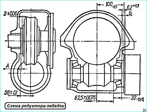 - - Größe 38 mm von der Achse des Getriebegehäuses Löcher für die Installation der Schnecke am inneren Stützende des Gehäuses;