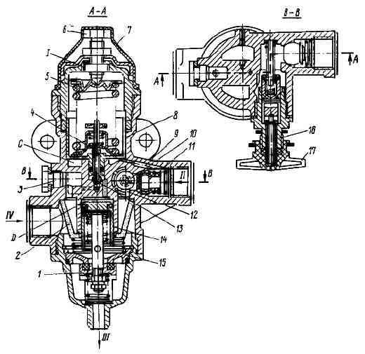 Entlastungsventil 1 dient auch als Sicherheitsventil. Wenn der Regler nicht bei einem Druck von 686,5–735,5 kPa (7–7,5 kgf/cm 2) arbeitet, öffnet sich Ventil 1 und überwindet dabei den Widerstand seiner Feder und der Kolbenfeder 14. Ventil 1 öffnet sich bei einem Druck von 980,7–1274,9 kPa (10–13 kgf/cm 2). Der Öffnungsdruck wird durch Ändern der Anzahl der unter der Ventilfeder installierten Unterlegscheiben eingestellt.