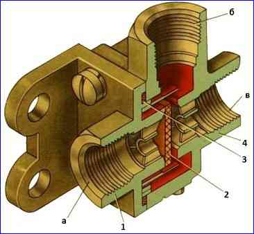 Zweileitungs-Bypassventil: 1 - Gehäuse; 2 - Membran; 3 - Dichtungsring; 4 - Abdeckung; a - Ausgang zum Beschleunigerventil; b - Ausgabe an die Zylinder von Energiespeichern; c – Ausgang zum Notbremslöseventil