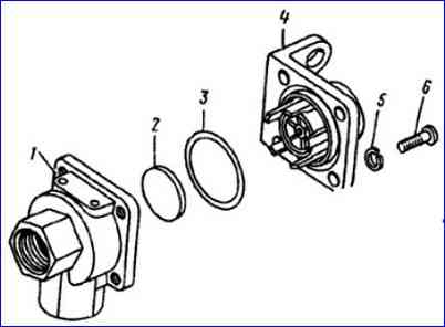 Zweileitungs-Bypassventil: 1 - Gehäuse; 2 - Siegel; 3 - O-förmiger Ring; 4 - Abdeckung; 5 - Federscheibe; 6 - Schraube