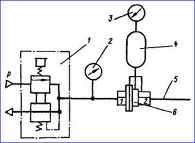 Anschlussplan für Doppelleitungsventil: 1 - Feinregelventil; 2, 3 - Manometer; 4 - Empfänger (5l); 5 - Rohrleitung mit einer Länge von mindestens 100 mm; 6 - Gerät (Doppelleitungsventil); Р = 730 kPa (7,5 kgf/cm 2)