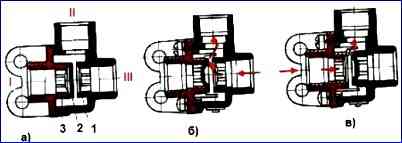 Zweileitungs-Bypassventil: a – Ausgangsstellung; b – Luftzufuhr vom Gaspedalventil zum Lösen der Bremsen über ein manuelles Bremsventil; c – Luftzufuhr vom Notbremslöseventil; I - Ausgang zum Beschleunigerventil; II – Ausgabe an die Energiespeicherzylinder; III – Ausgang zum Notbremslöseventil; 1 - Körper; 2 - Siegel; 3 – Cover