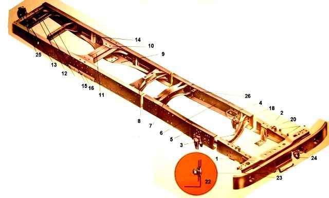 Der Wagenrahmen ist gestanzt, genietet, besteht aus zwei längenvariablen Holmen mit U-Profil, die durch Querträger verbunden sind