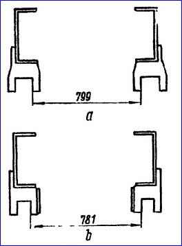 Die Abmessungen zwischen den Innenwangen der Vorderradaufhängungshalterungen (Abb.) sollten nicht mehr als 4 mm vom Nennwert abweichen