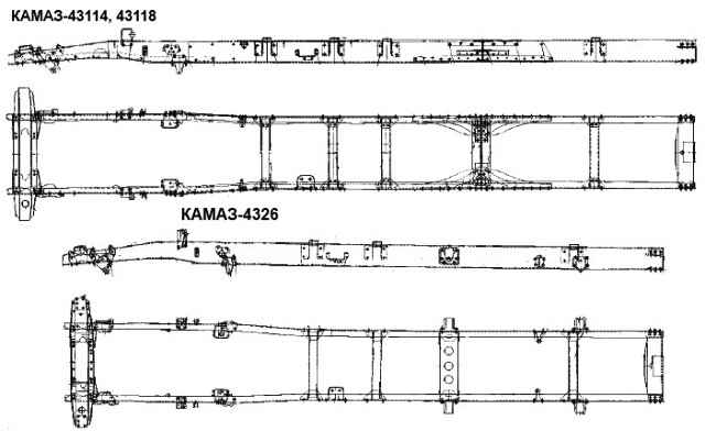 KAMAZ-Fahrzeuge verschiedener Modelle und Konfigurationen haben unterschiedliche Rahmen: je nach Basis lang; Anzahl und Ausführung der Querstreben; Verstärkungsbeläge und deren Gestaltung; Klammern und ihre Position.