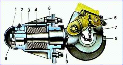 Zwischen zwei Flanschen befindet sich das gummielastische Element (Puffer) 4, das Stoßbelastungen beim Anfahren eines Fahrzeugs mit Anhänger und beim Fahren auf unebenen Straßen abfedert.