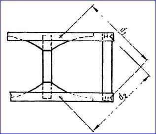 Die Differenz der Querdiagonalen (d1 – d2) (Abb.) zwischen den Befestigungslöchern des hinteren Querträgers im unteren Flansch des Längsträgers und Die Löcher für den Hinterachspuffer dürfen nicht mehr als 3 mm betragen.