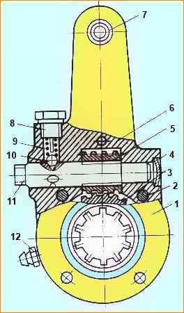 Abb.1. Einstellhebel: 1 – Abdeckung, 2 – Niete, 3 – Zahnrad, 4 – Stopfen, 5 – Schnecke, 6 – Körper, 7 – Buchse, 8 – Sicherungsbolzen, 9 – Sicherungsfeder, 10 – Sicherungskugel, 11 – Schneckenachse , 12 - Öler