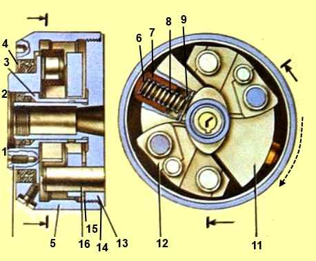 Sobald die Drehzahl der Kurbelwelle 1200 U/min zu überschreiten beginnt, übersteigen die resultierenden Zentrifugalkräfte der Lasten 11 die Kräfte der vorkomprimierten Federn 8. Dadurch beginnen die Gewichte auseinanderzulaufen und sich um die Achsen 16 zu drehen .