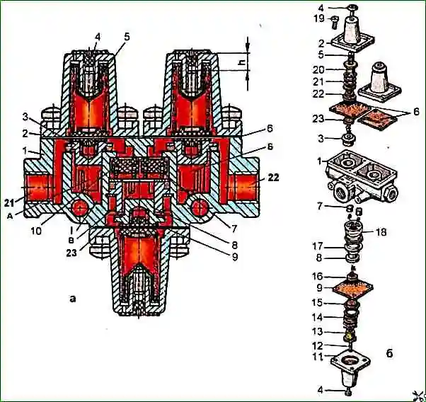 Gerät und Teile eines Dreifach-Sicherheitsventils: 1 - Körper; 2, 11 - Abdeckungen; 3 - Hauptkreislaufventil; 4 - Schutzstecker; 5, 12 - Einstellschrauben; 6, 9 - Membranen; 7 - Rückschlagventil; 8 - zusätzliches Kreislaufventil; 10 - Ventilfeder prüfen; 13, 20 - Führungsfedern; 14, 21 - Federn; 15, 22 - Federplatten; 16, 23 - Federdrücker; 17 - Druckring; 18 - Ring; 19 - Schrauben; 1. 3, 21, 22, 23 - Schlussfolgerungen; A, B, C - Hohlräume