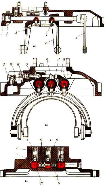 Schaltmechanismus: 1 - Stecker; 2 - Getriebedeckel; 3 - Schaltgabel für den vierten und fünften Gang; 4 - Stellschraube; 5 - Gabel zum Schalten des zweiten und dritten Gangs; 6 - Gabel zum Schalten des ersten Gangs und des Rückwärtsgangs; 7, 10, 19 - Bälle; 8, 14 - Federn; 9 - Glas; 11 - Stift; 12 - Getriebeentlüftung; 13 - Federteller für Sicherung des ersten Gangs und des Rückwärtsgangs; 15 - Sicherungsschieber; 16 - Gabelstangenkopf; 17 - Stange zum Schalten des zweiten und dritten Gangs; 18 - Stange zum Schalten des vierten und fünften Gangs; 20 - Stange zum Schalten des ersten Gangs und des Rückwärtsgangs