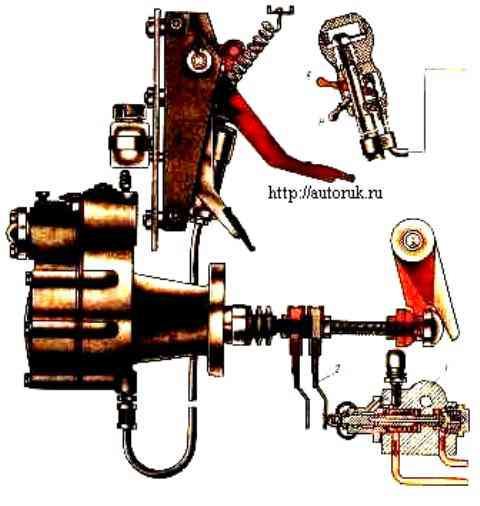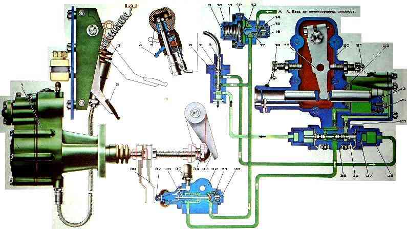 Verteilersteuerantrieb: 7 - pneumohydraulischer Kupplungsantriebsverstärker; 2 - Kupplungssteuerpedal; 3 - Hauptzylinder; 4 - Schalter des Getriebeverteiler-Steuerventils; 5 - Schalthebelgriff; 6 - Steuerventil; 7 - Spule; 8 - Krankabel; 9 - Stecker; 10 - Einstellscheiben; 11 - Ausgleichsfeder; 12 - Zwerchfell; 13 - Einlassventilschaft; 14 - Einlassventil; 15 - Einlassventilfeder; 16 - Federgehäuse; 17 - Druckminderventilkörper; 18, 21 - Siegel; 19 - Hebel; 20 - Gehäuse des Gangschaltmechanismus; 22 - Dichtungsring; 23 - Zylinderkolben; 24 - Kolbenmanschette; 25 - Drosselklappe; 26 - Luftverteilerzylinder; 27 - Luftverteilerkolben; 28 - Luftverteilerspule; 29 - Luftverteilergehäuse; 30 - Ventilfedergehäuse; 31 - Einlassventil; 32 - Getriebeteiler-Schaltventilgehäuse; 33 - Kupplungsgabelwellenhebel; 34 - Kugelmutter; 35 - Verschnaufpause; 36 - Ventilschaft; 37 - Stangenbegrenzer; 38 - Ventilschaftanschlag