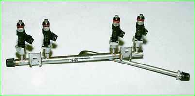 Der unter Druck stehende Kraftstoff wird in den inneren Hohlraum der Rampe und von dort über Düsen in das Ansaugrohr geleitet.