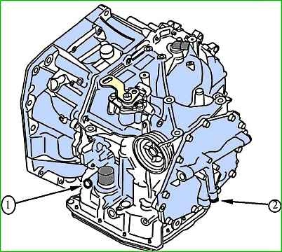 Anschlusspunkte für ein Manometer zur Prüfung des Drucks in der Automatikgetriebeleitung: 1 - Anschlusspunkt für ein Manometer zur Prüfung in den Positionen „D“, „1“, „2“ des Bereichsschalters; 2 - Anschlusspunkt für ein Manometer zur Überprüfung der Position „R“ des Bereichsschalters