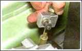 Lösen Sie vom Boden des Fahrzeugs aus mit einem 13-mm-Schraubenschlüssel den Anzug der Mutter der Verbindungsschraube der Klemme, mit der die Steuerstange am Schaft des Schaltstangenscharniers befestigt ist (Abb. 1)
