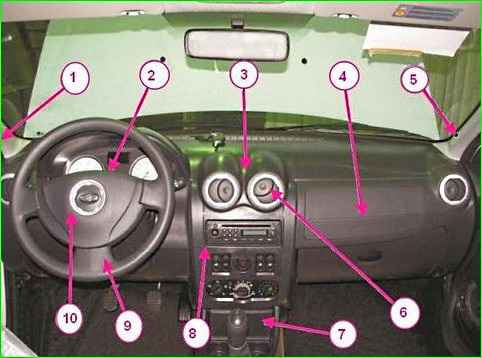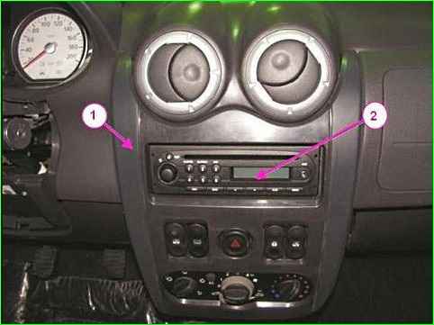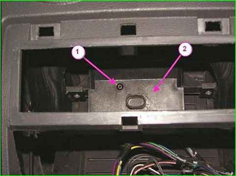 Schrauben Sie die Schraube 1, Abbildung 9, ab, mit der die Instrumententafel durch das Fenster befestigt ist, das sich nach dem Entfernen des Radios und des CD-Players öffnete (austauschbarer Torx-T20-Kopf, Verlängerung, Knopf).