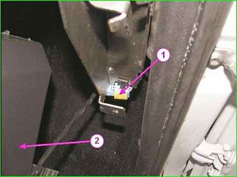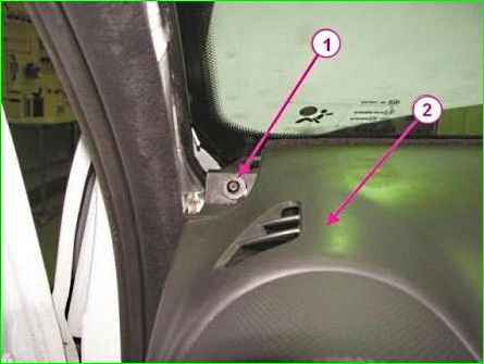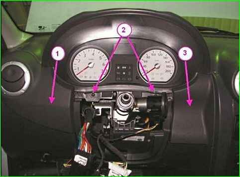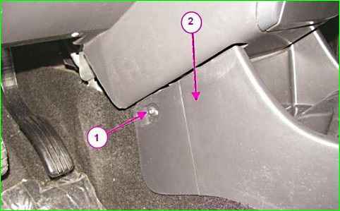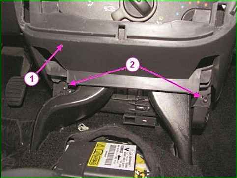 Lösen Sie eine Schraube 1 auf der rechten und linken Seite, Abbildung 12, der oberen Befestigung der Instrumententafel 2 (austauschbarer Torx-T20-Kopf, Knopf).