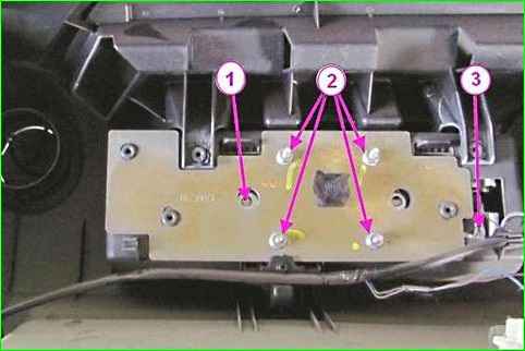 Lösen Sie die beiden Schrauben 1, Abbildung 10, mit denen das Steuergerät für Heizung, Klimaanlage und Lüftung 3 an der Instrumententafel befestigt ist, drücken Sie die Klammern 2 zusammen und schieben Sie die Einheit in die Instrumententafel (austauschbarer Kopf Torx T20, Knopf).