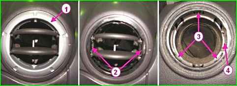 Entfernen Sie den Innenring 2 der Lüftungsdüse und entfernen Sie durch Drücken der drei Klammern 3 das Gehäuse 4 der Lüftungsdüse von der Instrumententafel