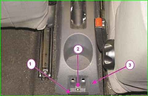 Den Widerstand der Klemmen überwinden, den Zierstopfen 1 zurückklappen, Abbildung 2, die Schraube 2 herausdrehen und den hinteren Teil der Bodentunnelverkleidung 3 entfernen (flacher Schraubendreher, austauschbarer Torx-T20-Kopf, Schraubenschlüssel).