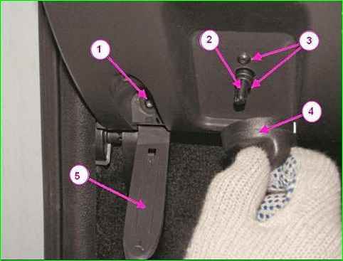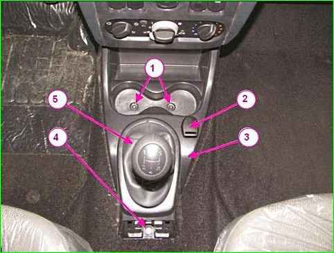 Mutter 4, Abbildung 4, und zwei Schrauben 1 abschrauben. Abdeckung 5 des Schalthebels abnehmen.