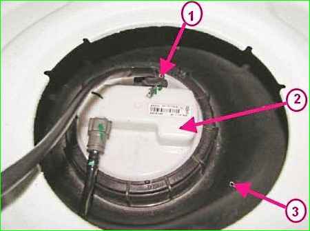Trennen des hinteren Kabelbaumblocks vom elektrischen Kraftstoffpumpenmodul: 1 - hinterer Kabelbaumblock vom elektrischen Kraftstoffpumpenmodul; 2 - elektrisches Kraftstoffpumpenmodul; 3 – Kraftstofftank