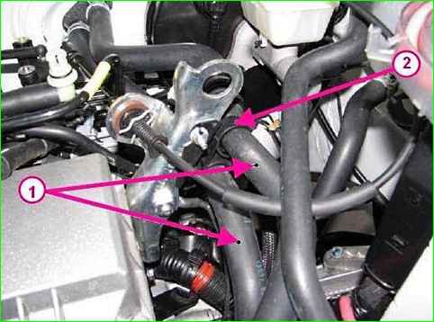 Trennen der Kraftstoffleitung vom Kraftstoffverteiler: 1 - Kraftstoffleitung; 2 – Kraftstoffverteiler