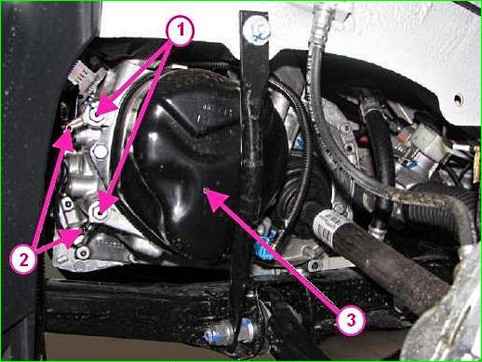 Erdungskabel vom Getriebe trennen: 1 - Befestigungsschraube; 2 - Erdungskabel; 3 - Getriebe