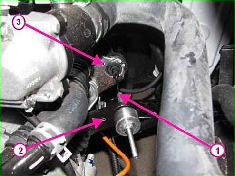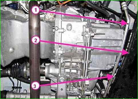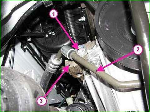 Trennen der Servolenkungsleitung vom Vorderradaufhängungs-Hilfsrahmen: 1 - Servolenkungsleitung; 2 - Hilfsrahmen der Vorderradaufhängung; 3 - Schraube zur Befestigung der Servolenkungsleitung