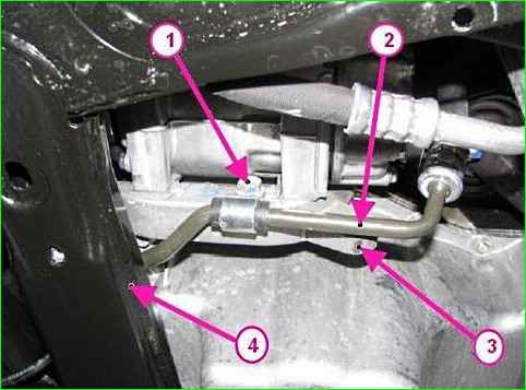 Trennen der Servolenkungsleitung von der Montagehalterung für Anbauteile Gebrauchsgut (für ein Auto mit K7M-Motor): 1 - Schraube zur Befestigung der Servolenkungsleitung; 2 - Servolenkungsleitung; 3 - Halterung zur Montage montierter Einheiten; 4 - Hilfsrahmen der Vorderradaufhängung