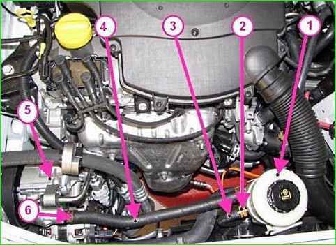 Trennen der Rohrleitung von der Servolenkungspumpe: 1 - Servolenkungsbehälter; 2 - Klemme; 3 - Schlauch; 4 - Schlauch; 5 - Servolenkungspumpe; 6 - Klemme