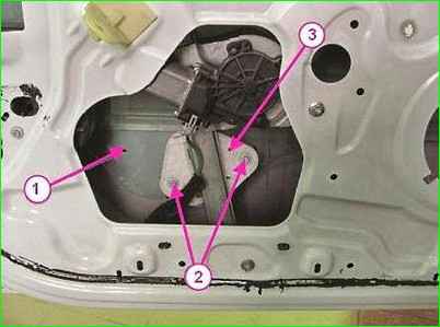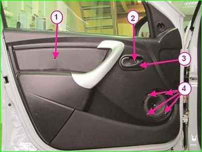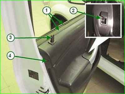 - Abdeckung 1, Abbildung 2, Fensterhebergriffe von der Türverkleidung entfernen, Befestigungswinkel 2 entfernen, Griff 3 entfernen.