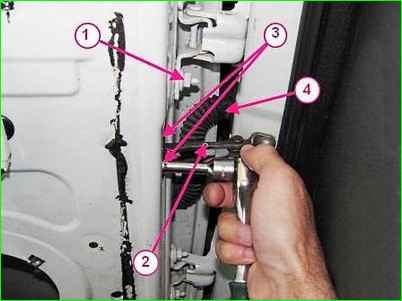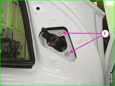 Lösen Sie mit einem 13-mm-Schlüssel die vier Muttern 1, mit denen die Tür am Scharnier befestigt ist, und entfernen Sie die Vordertür (führen Sie diesen Vorgang mit einem Assistenten durch).