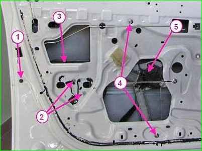 Lösen Sie mit einem 10-mm-Schlüssel die drei Muttern 4, Abbildung 5, entfernen Sie den Fensterheber 5 durch die Öffnung in der Türverkleidung und trennen Sie den Kabelbaumblock davon.