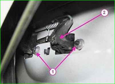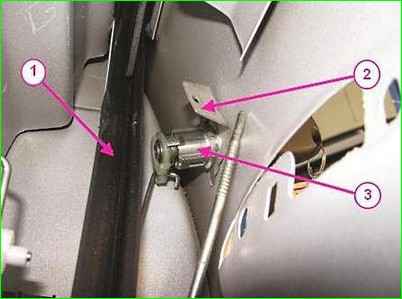 Entfernen Sie die Federhalterung 2 (Abbildung 7), sichern Sie den Schalter 3 des Vordertürschlosses, entfernen Sie den Schalter und trennen Sie die Verriegelungsstangen davon.