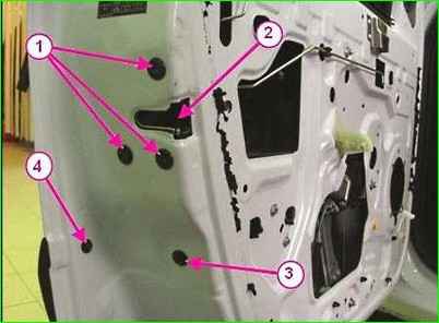 Lösen Sie mit einem Torx-T30-Schraubendreher die Schraube 2 (Abbildung 1), mit der der Innentürgriff 3 befestigt ist. Trennen Sie die Verriegelungsstange vom Griff und entfernen Sie den Griff.