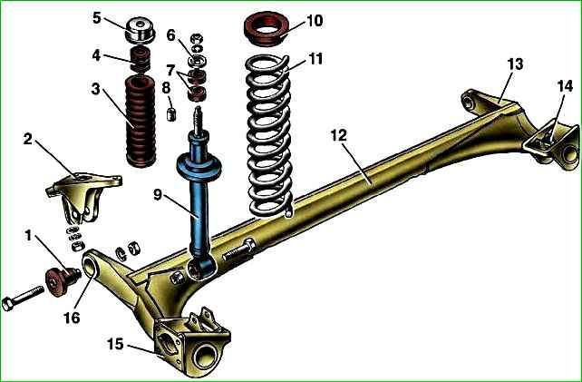 Die Hinterradaufhängung des Wagens ist halbunabhängig und basiert auf einem elastischen Träger mit Längslenkern, Schraubenfedern und doppelt wirkenden Teleskopstoßdämpfern.