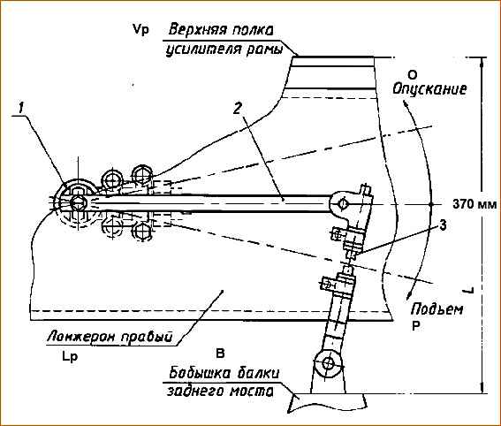 Die Installation des Hebels 2 in horizontaler Position mit der eingestellten Position „Transport“ (370 mm) erfolgt durch Anpassen der Länge der Stange 3.