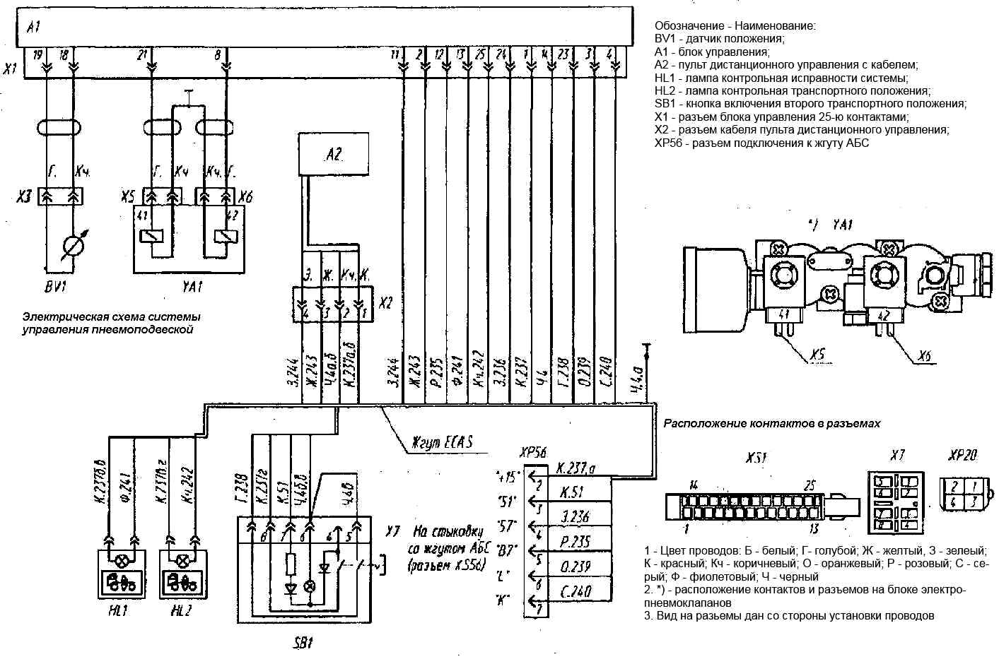 Das System enthält eine Mikroprozessoreinheit 18 (Abbildung), die sich unter der Instrumententafel befindet, eine Federungsfernbedienung 19, die auf der linken Seite des Fahrersitzes installiert ist, einen Block elektropneumatischer Ventile 17 und einen induktiven Federungspositionssensor 16, der installiert ist im hinteren Teil des rechten Rahmenlängsträgers.