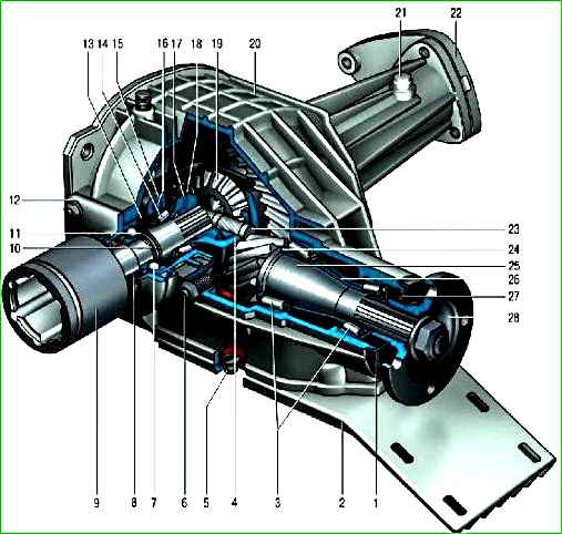 Die Vorderachse des Chevrolet Niva besteht aus einem Hauptgetriebe und einem Differenzial, die in einem Gehäuse untergebracht sind